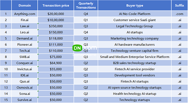 本次榜单中 13 个席位被.ai 后缀占据,交易呈现两大特征:垂直赛道全覆盖:法律(Law.ai)、营销(Demand.ai)、硬件(Pioneer.ai)、中小企业服务(SMB.ai)等赛道均出现抢注,买家涵盖科技 VC、垂直技术公司、AI 初创企业;Q3 成交易高峰:超 60% 的.ai 交易集中在 Q3.50 万 - 150 万美元是主流区间,反映行业对 “AI 落地场景” 的预期升温。