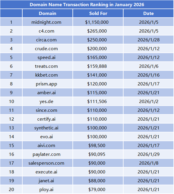 2026年1月域名交易市场已落下帷幕,最新交易排行榜显示,全球域名交易热度持续攀升,经典后缀与新兴赛道的价值分化愈发明显。