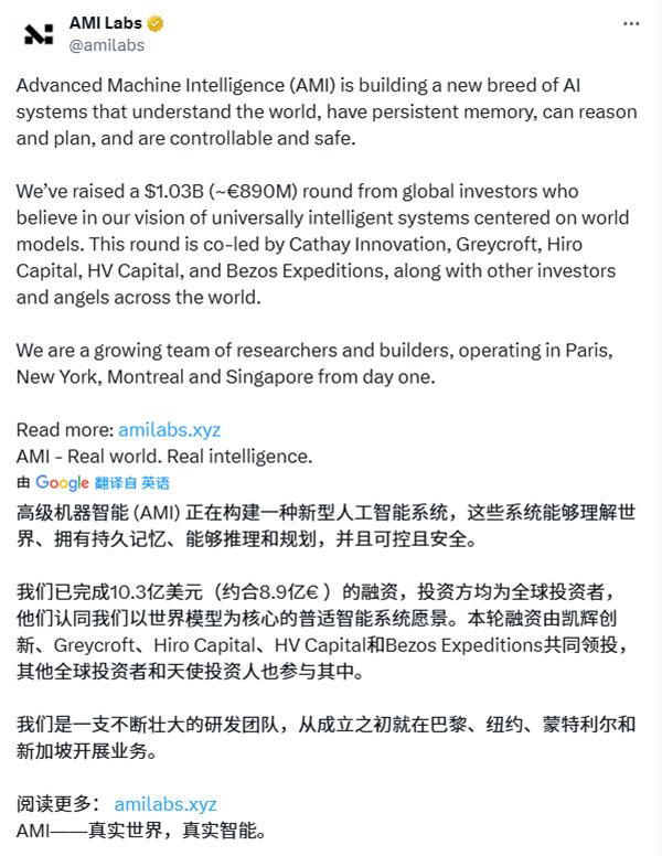 2026年3月10日,AI 领域重磅消息传来:由图灵奖得主、前 Meta 首席AI科学家杨立昆(Yann LeCun)创立的 AMI Labs(Advanced Machine Intelligence Labs) 正式宣布完成 10.3 亿美元(约 8.9 亿欧元)种子轮融资,投前估值达 35 亿美元,一举刷新欧洲科技公司种子轮融资规模纪录,成为全球 AI 基础研究领域又一里程碑事件。