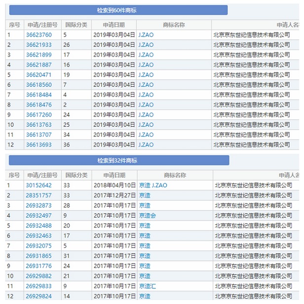 事实上除了注册域名之外,京东集团还向国家商标局申请注册了大量“京造”相关商标。商标局数据显示,京东集团于2017年10月17日申请了30枚“京造、京造会、京造荟、京造汇”等商标;2018年4月10日以及2019年3月4日,京东再次向商标局递交了累计60枚“J.ZAO”商标注册申请。