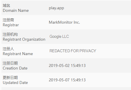 查询发现,域名Play.app的注册时间是2019年5月2日,这枚域名的品相、含义相信大家一眼很能看出来,主体中的Play是常见常用的英文单词,而联系到注册者谷歌本身,这枚域名的价值立马就显现出来了。